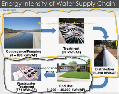 That's how much energy's used to cradle-to-grave a water drop from the Sierras to the outflow of a wastewater treatment plant. My district is a water wholesaler - we handle the first three steps, and then a water retailer (either a private company or city government) buys the water from us, gets it to the end user, and picks it up from there to a sewage treatment plant. You can see the main energy use is the end user, mainly because they heat it. Our staff argues that end use is by the end user, not our responsibility, and I said I'd have to chew on it. Any thoughts? Possibly relevant is that the vast majority of water we sell them never gets heated, so that end use figure conflates some very high and much lower energy using water together.